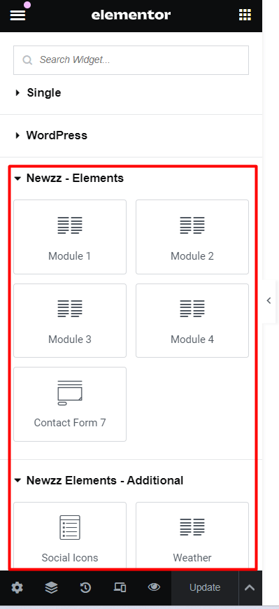 Note: To use our elements scroll down from the Elementor editor then you will see “Newzz Elements” With these elements you can edit your homepage with advanced options and make it any layout you prefer. Drag and drop the elements and play around to fit with your design.